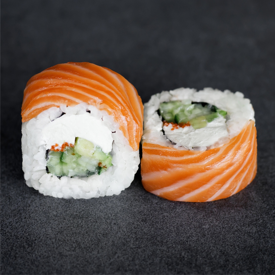 Вага: 280 гр. / 8 шт.Рис, норі, лосось, авокадо, сир вершковий, огірок, ікра тобіко, імбир, васабі, соус соєвий.