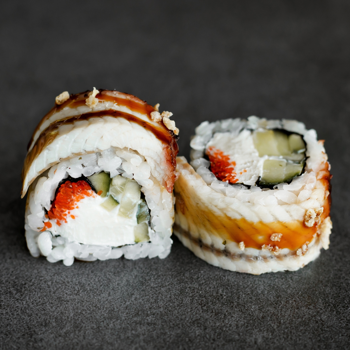 Вага: 275 гр. / 8 шт.Рис, норі, вугор, огірок, авокадо, сир вершковий, ікра тобіко, цибулева крихта, соус унагі.