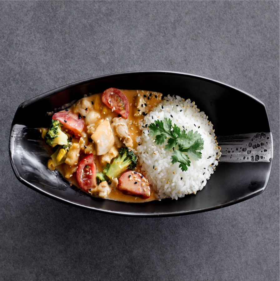 Рис, куряче філе, томати чері, броколі, кукурудза, кінза. кокосовий соус, кунжут.