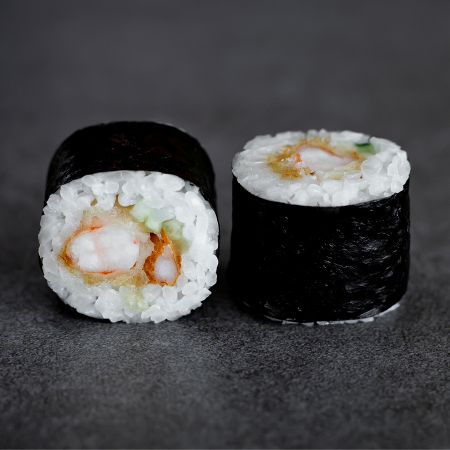 Рис, норі, креветка темпура, огірок, васабі, імбир, соус соєвий.