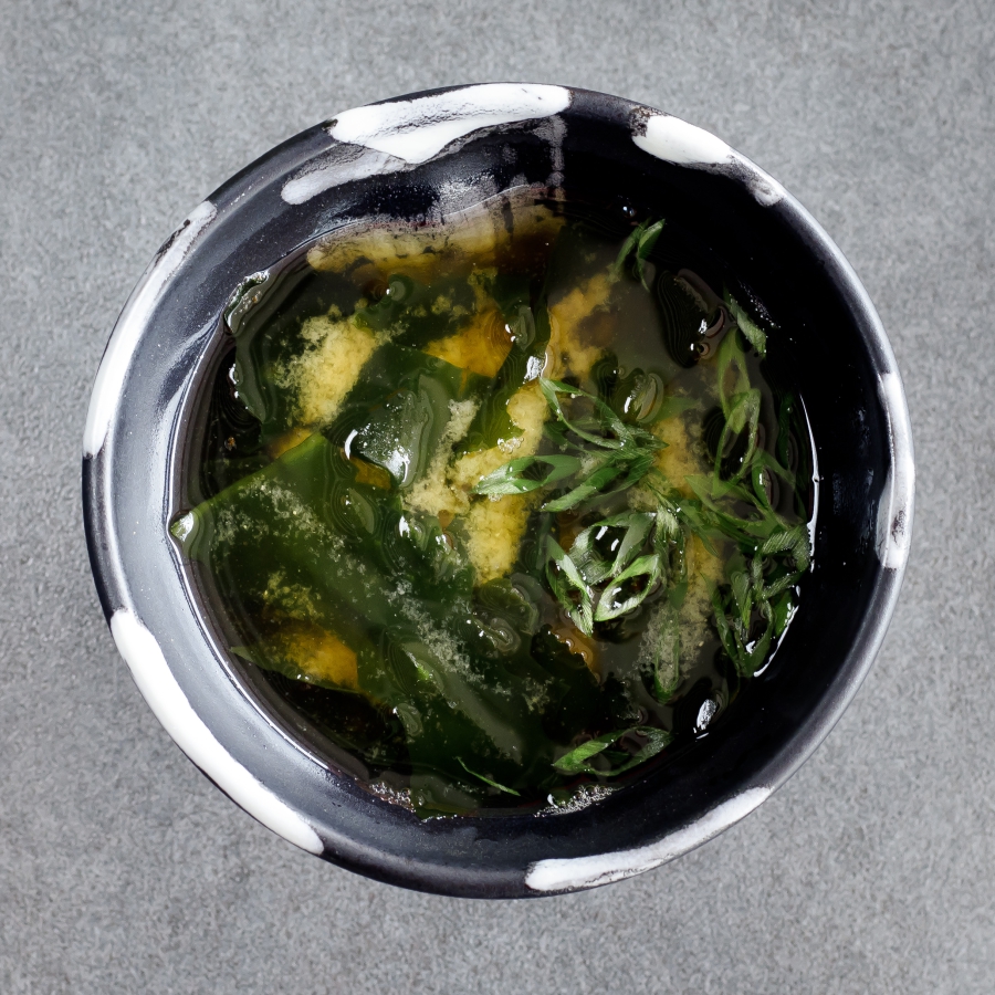 Місо бульйон, сир тофу, водорості вакаме, цибуля зелена.