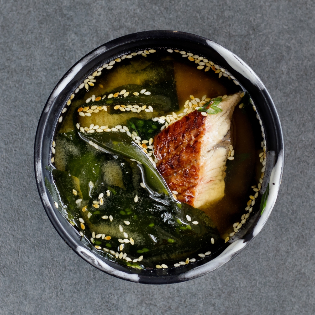 Місо бульйон, вугор, сир тофу, вакаме, цибуля зелена, кунжут.