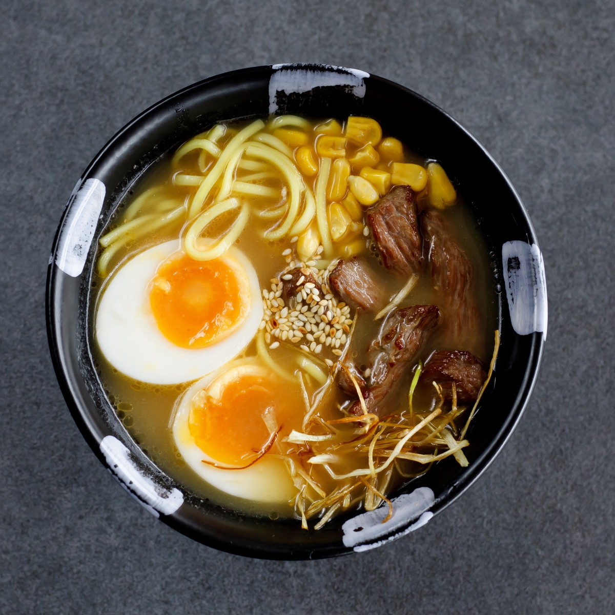 Бульйон, локшина рамен, яловичина, норі, кукурудза, яйце мариноване, цибуля порей, кунжут.