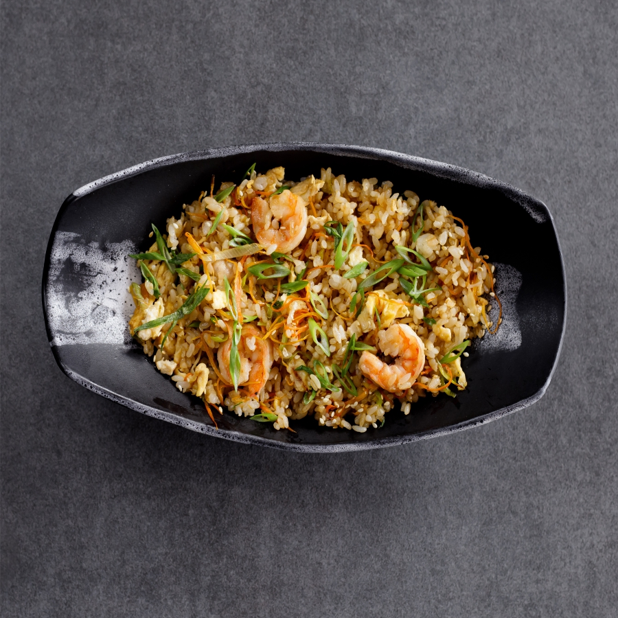 Рис, тигрові креветки, морква, яйце. цибуля порей, цибуля зелена, кунжут, часник, соус устричний.