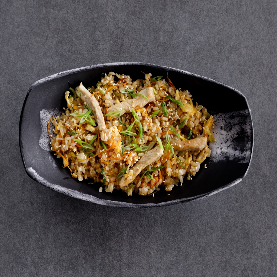 Рис, куряче філе, морква, яйце, цибуля порей, цибуля зелена, кунжут, часник, соус устричний.