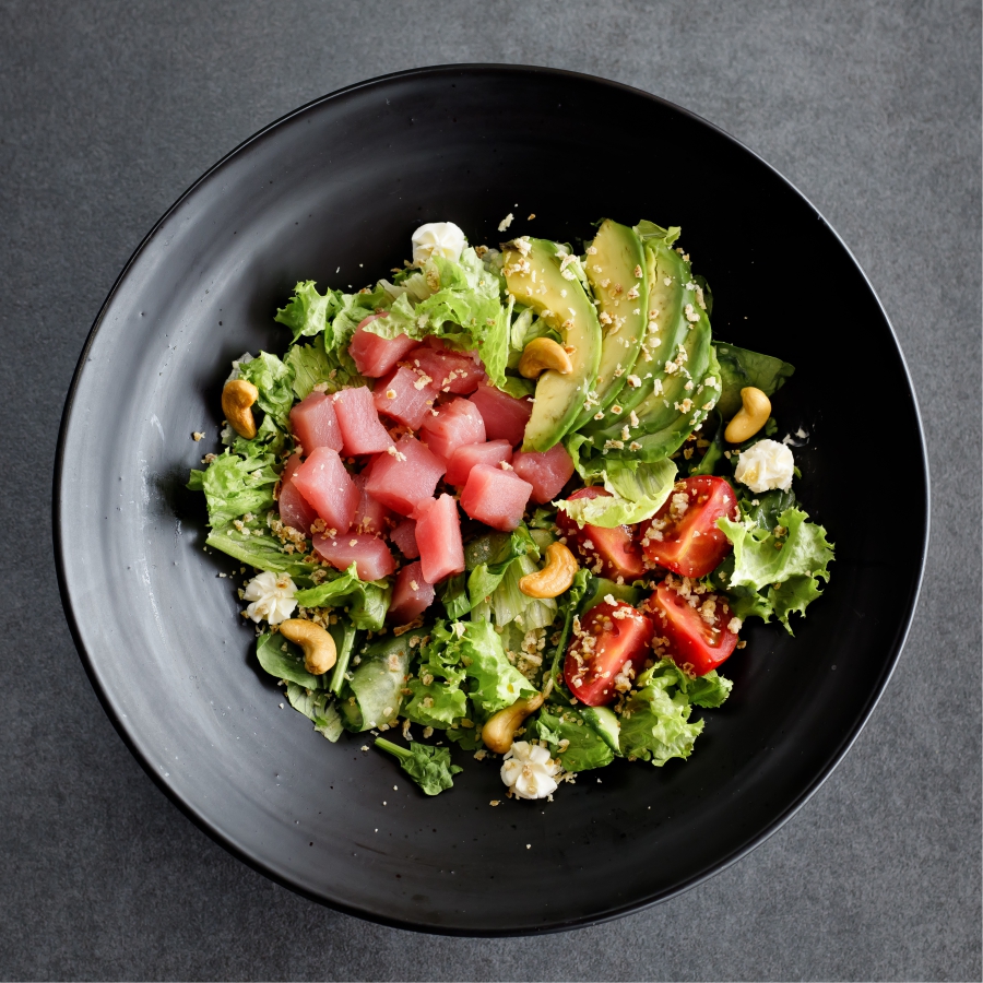Тунець, мікс салатів, томат, огірок, авокадо, сир вершковий, кеш’ю, цибулева крихта, соус солодкий чилі.