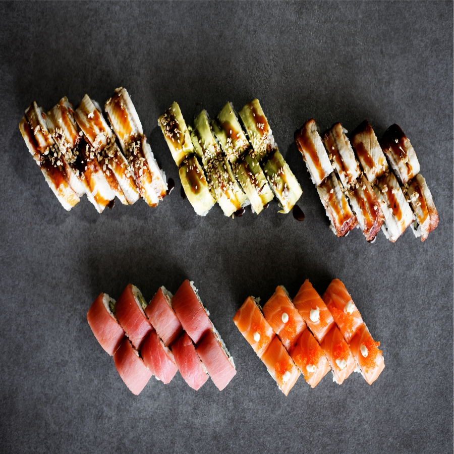 Вага 1330 г/ 40 шт Червоний дракон, золотий дракон, зелений дракон, філадельфія lux з тунцем, філадельфія Lux з вугрем, імбир, васабі, соус соєвий.