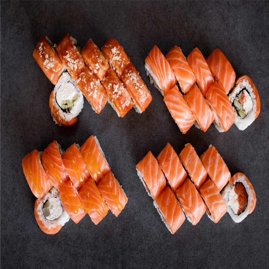 Філадельфія люкс з лососем, філадельфія дабл фіш, філадельфія лосось гриль, філадельфія люкс лосось та ананас.