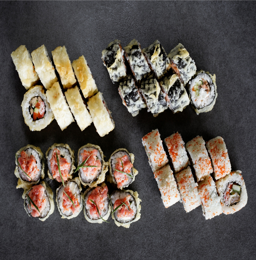 Теплий рол з лососем. теплий рол з тунцем, теплий рол з сніжним крабом, кранч рол з креветкой та крабом, імбир, васабі, соус соєвий.
