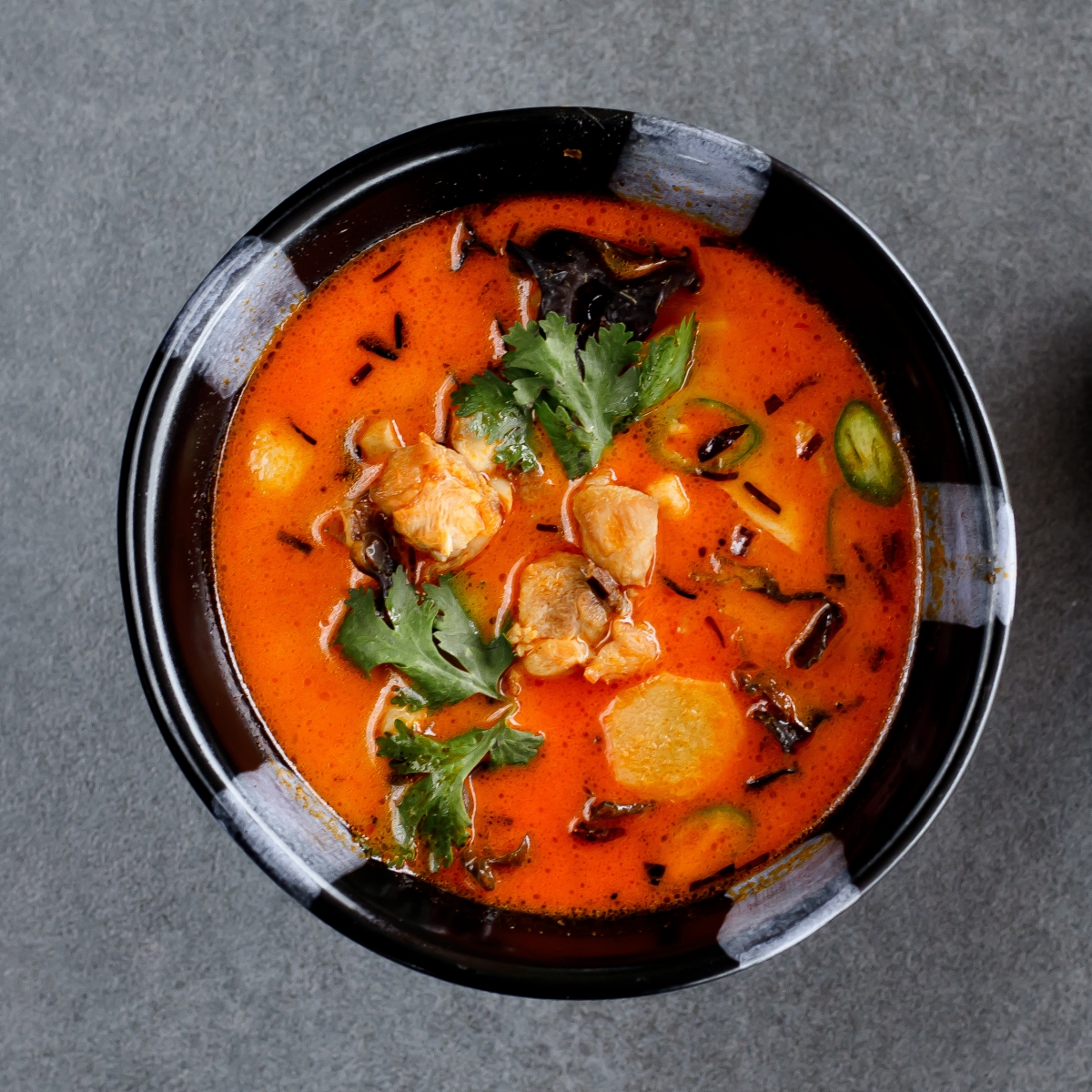 Бульйон курячий, куряче філе, печериці, гриби фунгус, імбир, кінза, лайм, цибуля синя, перець чілі, паста том ям, кокосове молоко.