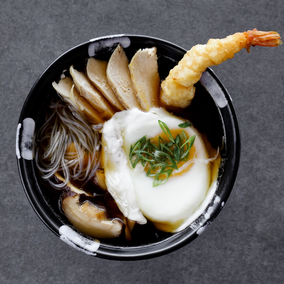 Курячий бульйон, локшина фунчоза, куряче філе, креветка темпура, гриби шитакі, вакаме, мариноване яйце, цибуля зелена.